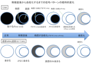 | 検査 | 【画像検査】 ①造影MRI(MRA、T2WI、造影MRA元画像、脂肪抑制T1WIなどで診断) ・intimal flapおよびdouble lumen ・壁内(偽腔内)の三日月状あるいは半月状の血腫 ![]() ②脳動脈造影(DSA):治療方針の決定に必要 |